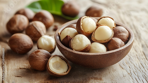Fresh macadamia nuts in wooden bowl, showcasing their creamy white kernels surrounded by brown shells. rustic setting evokes sense of natural beauty and healthy snacking