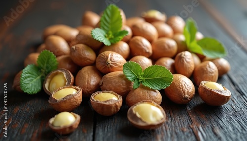 Fresh macadamia nuts piled on dark wood table. Nuts whole in shell, others cracked open. Creamy kernels visible inside. Green leaves decorate healthy superfood snack. Natural plant-based ingredient