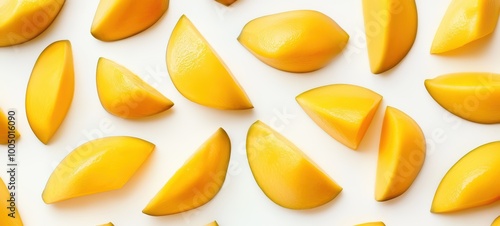 Fresh mango slices with their golden-yellow flesh, laid out against a white background