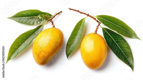 Fresh Mangoes with Green Leaves on White Background
