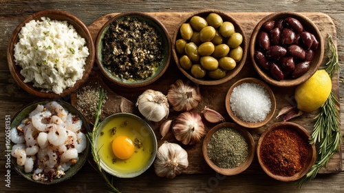 Fresh Mediterranean diet ingredients arranged on a wooden table, showcasing healthy and balanced eating.