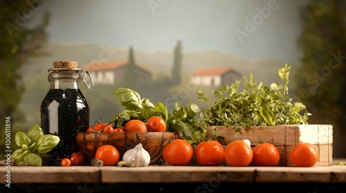 Fresh Mediterranean Ingredients with Olive Oil in Rustic Setting and Beautiful Hills in Background