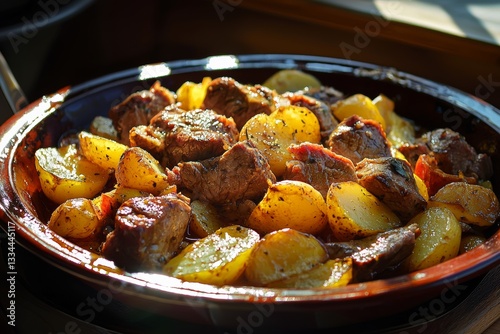 Fresh Mediterranean lamb and potato dish with herbs in rustic kitchen under natural sunlight close-up photograph