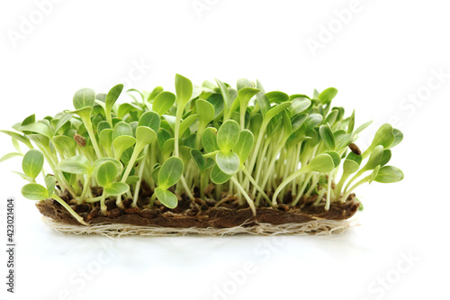 Fresh micro greens closeup. Milk Thistle sprouts for healthy salad. Microgreens sprouts isolated on white background. Vegan micro greens shoots.