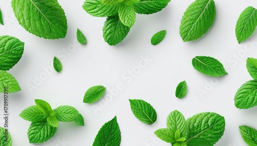 Fresh mint leaves scattered on white background