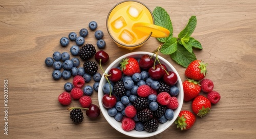 Fresh Mixed Berries and Citrus Drink on Wooden Table