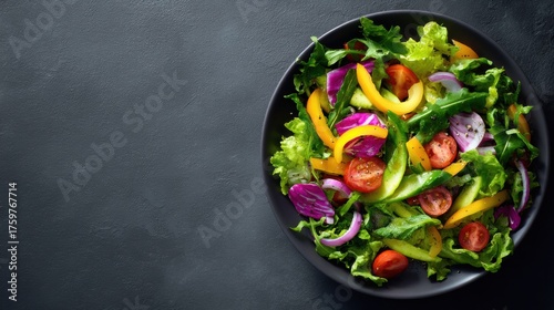 Fresh mixed salad with lettuce, cherry tomato, avocado, yellow pepper, red onion and purple radicchio tossed in dressing, bright colorful healthy bowl ready to eat