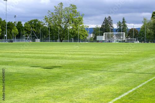 Fresh mowed football field at springtime. Photo taken May 27th, 2021, Zurich, Switzerland.