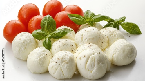Fresh mozzarella balls, ripe tomatoes, and fragrant basil leaves, ideal for a delicious Caprese salad or gourmet dish.