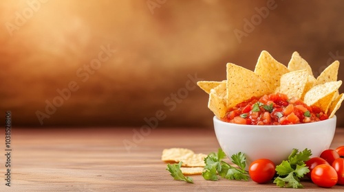 Fresh nachos with salsa and cherry tomatoes on wooden table