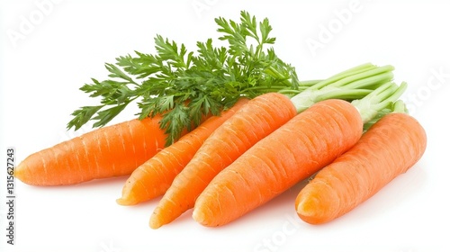 Fresh, orange carrots with green tops, isolated on white background.