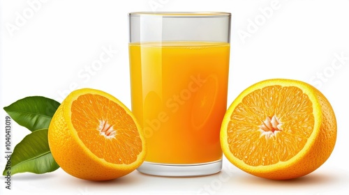 Fresh orange juice in a glass with halved oranges and green leaves, vibrant and inviting for a healthy lifestyle.