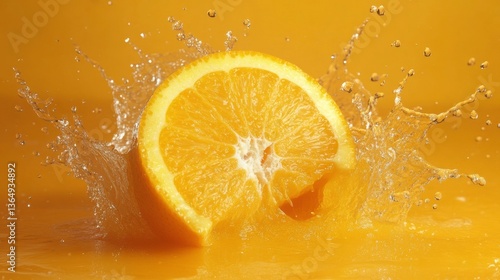 Fresh Orange Slice Splashes in Vibrant Yellow Backdrop