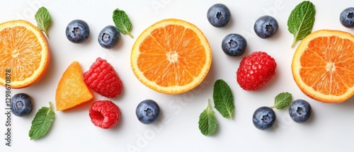 Fresh Orange Slices, Blueberries, Raspberries, and Mint Leaves on White Background