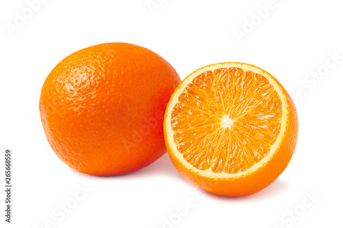Fresh oranges, one whole and one half isolated on white background with shadow