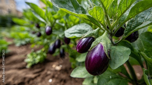 Fresh organic eggplant growing in a home garden