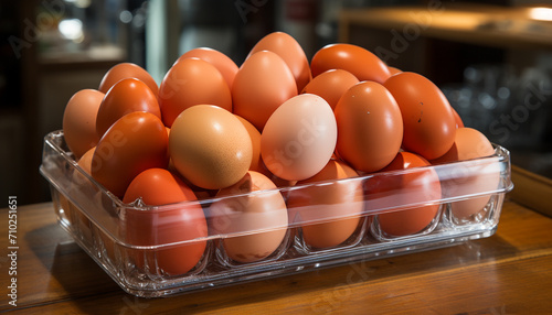 Fresh organic eggs in a wooden carton indoors generated by AI