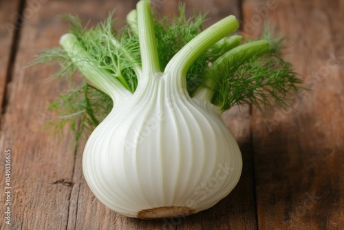 Fresh Organic Fennel Bulb and Leaves on Rustic Wooden Table