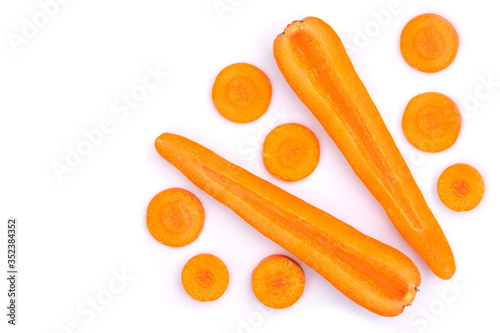 Fresh organic slice of orange carrot isolated on white background. Top view. Flat lay. Copyspace for text.