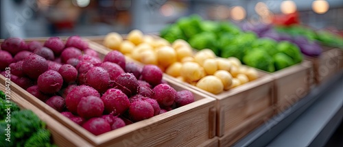 Fresh Organic Vegetable Display in Wooden Crates at Market Stall