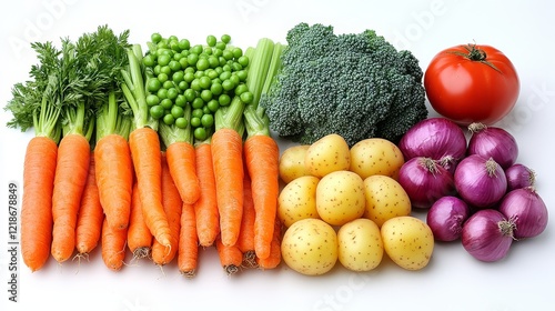 Fresh Organic Vegetables Carrots Potatoes Onions Broccoli Peas and Tomatoes