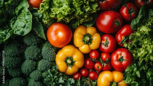 Fresh Organic Vegetables Assortment Featu Red and Yellow Bell Peppers Tomatoes Leafy Greens and Broccoli in a Healthy Food Display