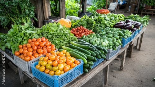 Fresh Organic Vegetables Displayed on Market Table with Vibrant Colors in Agricultural Setting