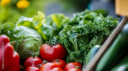 Fresh Organic Vegetables in a Rustic Wooden Box Surrounded by Vibrant Greenery : Generative AI