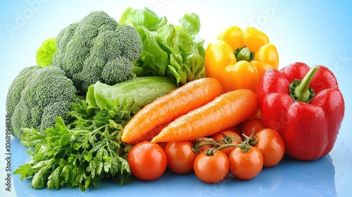 Fresh Organic Vegetables on Blue Background: Healthy Broccoli, Carrots, Tomatoes, and Peppers