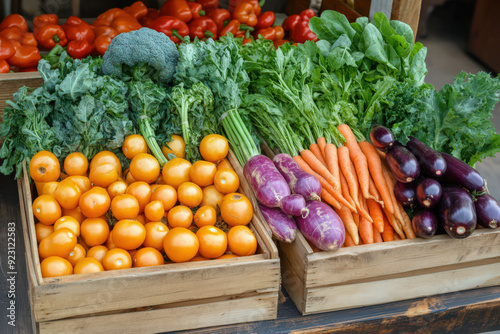 Fresh organic vegetables on display at a farmer's market including tomatoes, kale, broccoli, carrots, radishes, and eggplants in wooden crates.