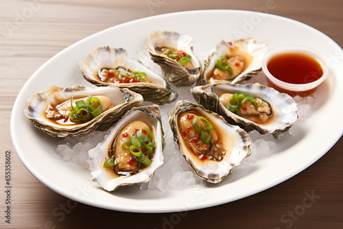 Fresh oysters on ice with pomegranate sauce.