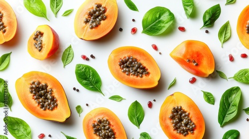 Fresh papaya slices, basil leaves, pomegranate seeds, white background. Healthy food styling