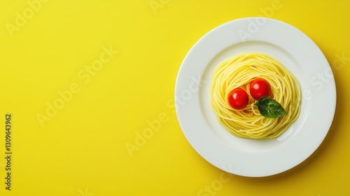 Fresh Pasta with Cherry Tomatoes and Basil on Bright Yellow Background