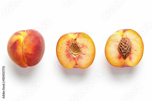 Fresh peach fruit sliced in half and arranged in rows top view white background