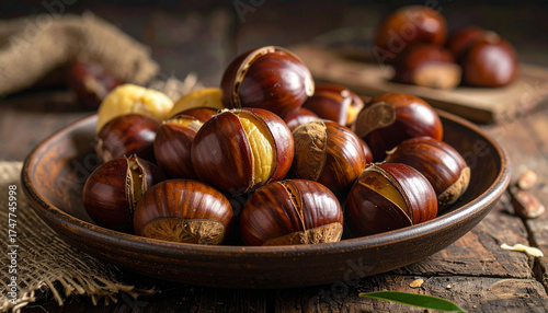 Fresh peeled water chestnuts on rustic plate, macro close-up detail