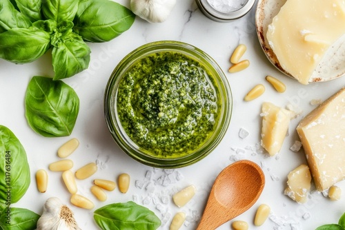 Fresh Pesto Sauce in Jar with Basil, Parmesan, and Pine Nuts
