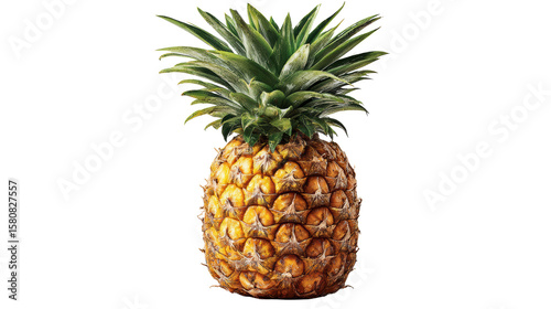 Fresh pineapple, tropical fruit with textured skin and vibrant green leaves, isolated on a white background.