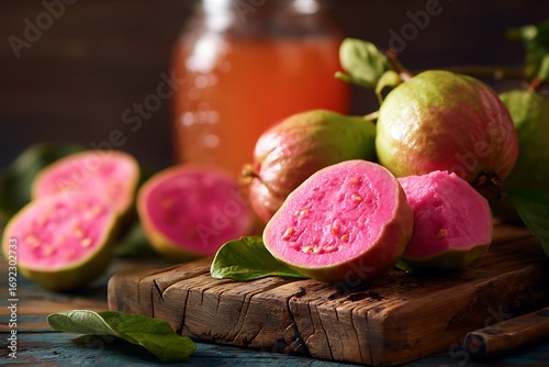 Fresh Pink Guavas with Juice on Rustic Table Highlighting Vibrant Color Sweet Flavor and Nutritional Richness of Tropical Fruit