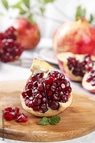 Fresh Pomegranate with Ruby Seeds and White Pulp on Wooden Board - Healthy Exotic Fruit