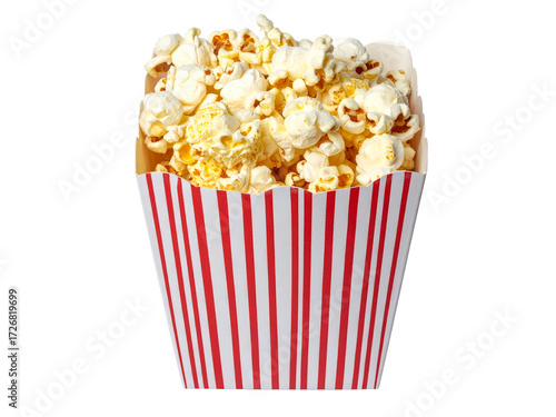 Fresh popcorn in striped box, classic cinema snack, perfect for movie nights, isolated on white background, crunchy and buttery popcorn treat.