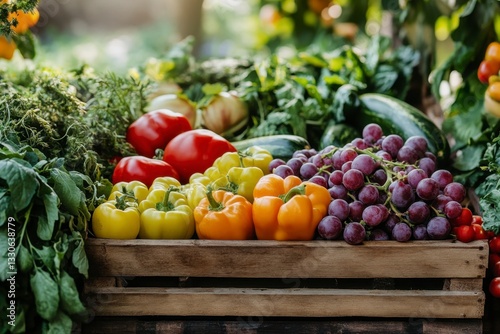 Fresh Produce in Wooden Crate: Peppers, Tomatoes, Grapes, Zucchini, Herbs, Onions - Harvest Bounty