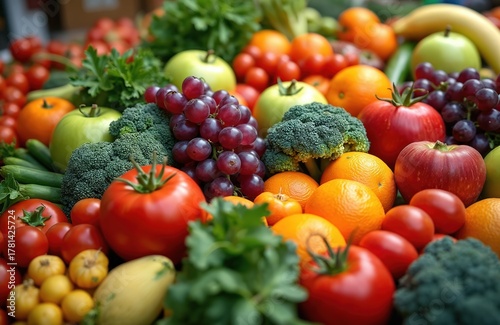 Fresh produce variety including grapes, apples, tomatoes, oranges, broccoli. Healthy organic assortment for cooking shopping. Nutritious diet content for food blogs. Close up of vibrant fruits,