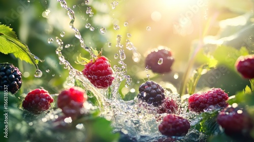 Fresh raspberries splashing in water, highlighting their vibrant colors and freshness.