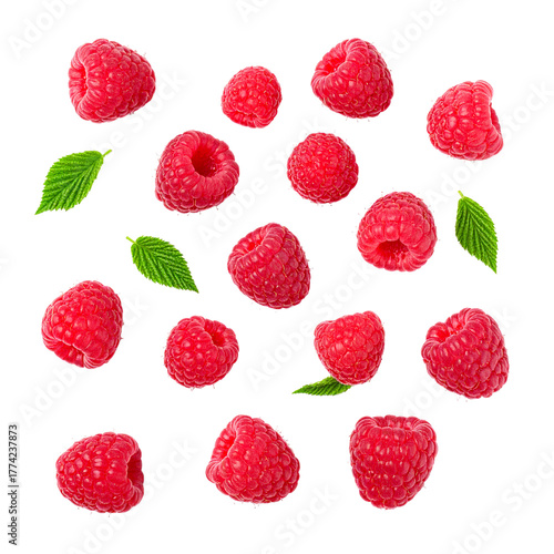 Fresh Raspberry Delight: Vibrant, juicy raspberries and fresh leaves arranged for a close-up visual feast.