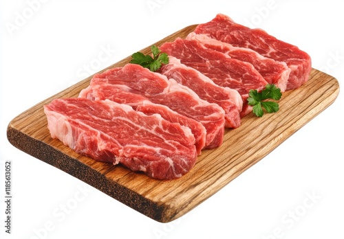 Fresh Raw Beef Cuts on Wooden Board Ready for Cooking or Grilling, Perfect for Culinary Creations and Barbecue Parties with Fresh Herbs Garnish