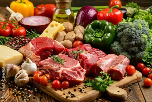 Fresh raw beef meat, cheese, herbs, vegetables, spices, olive oil, and other ingredients for delicious and healthy cooking are waiting on a wooden cutting board