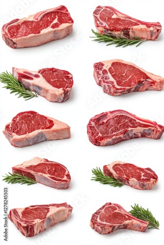 Fresh Raw Beef Steaks Assortment on White Background Culinary Meat Cuts with Rosemary Garnish Top View Food Photography for Restaurant Menu