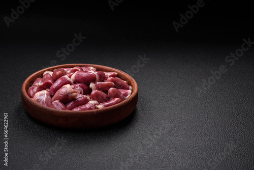 Fresh raw chicken, turkey or duck hearts on a ceramic plate with salt and spices