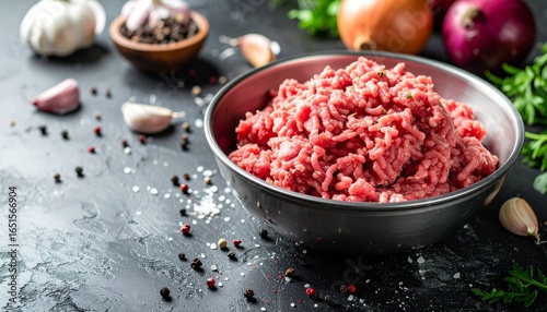 Fresh raw ground meat in a bowl, accompanied by garlic, onions, and various spices. An essential ingredient for versatile culinary creations and delicious homemade meals.