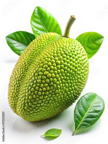 Fresh raw jackfruit on a plain white background with a few leaves scattered around